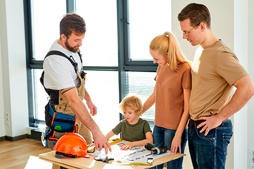 A family collaborates on a construction project, showcasing teamwork and shared effort in McAllen.