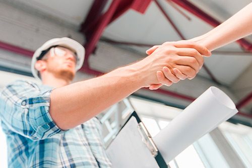 A man and woman shake hands over a blueprint, representing partnership and trust in McAllen's commercial construction industry.